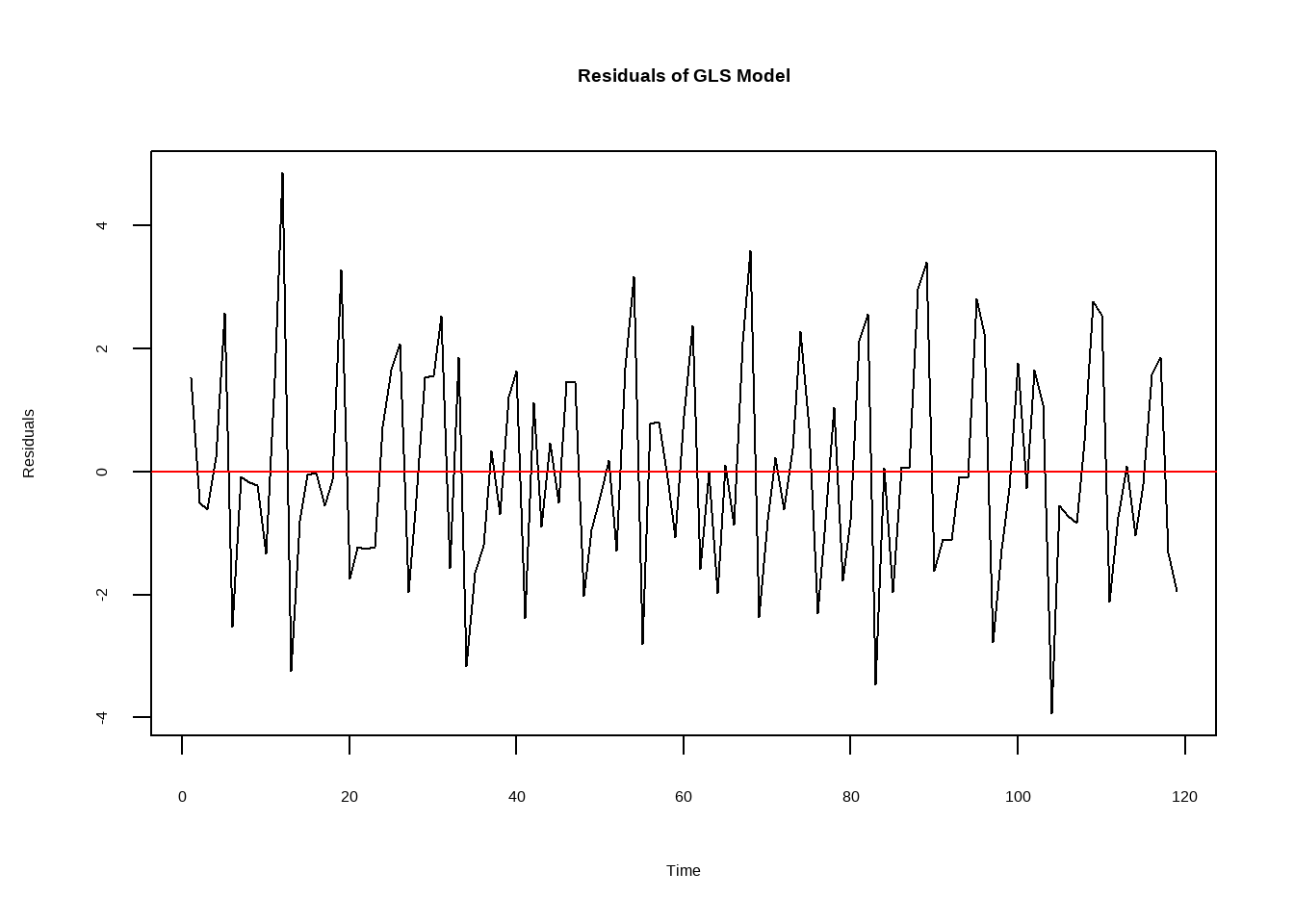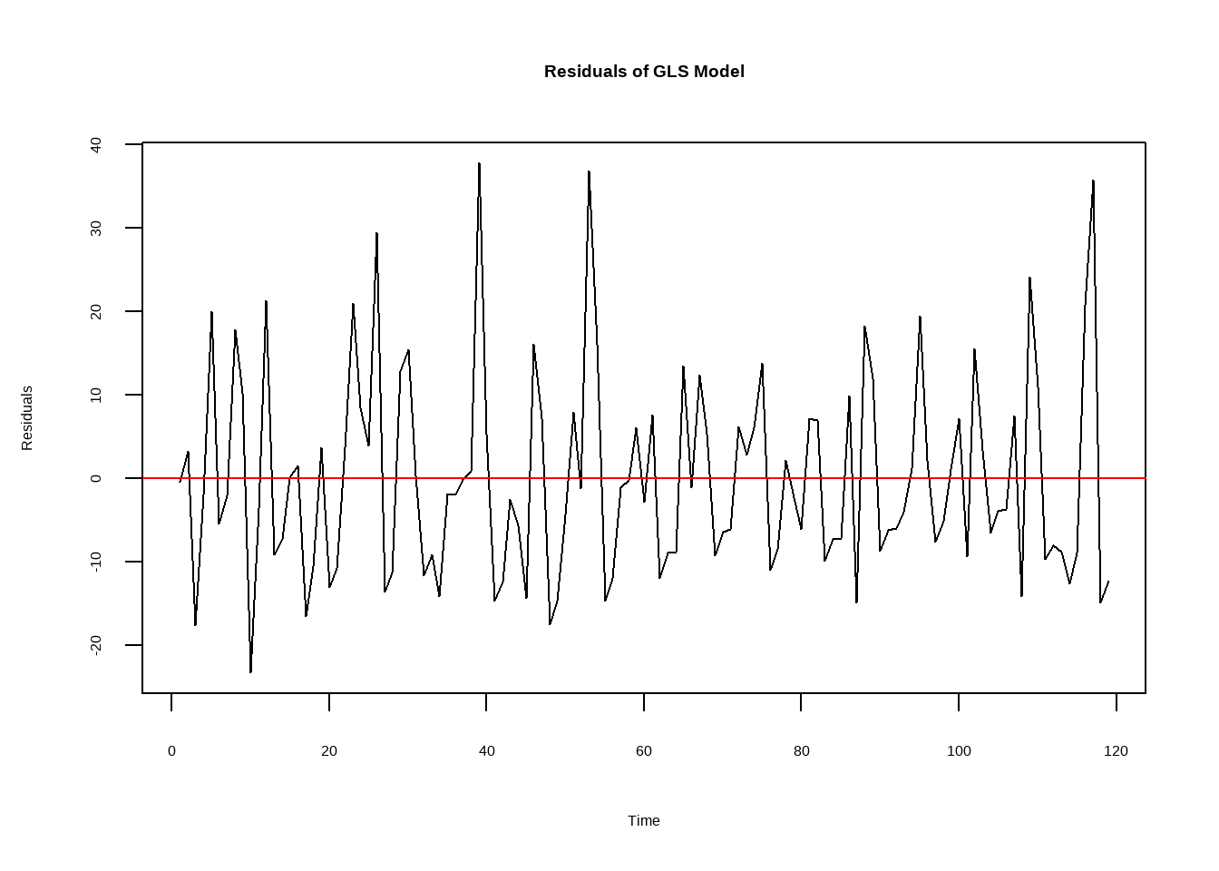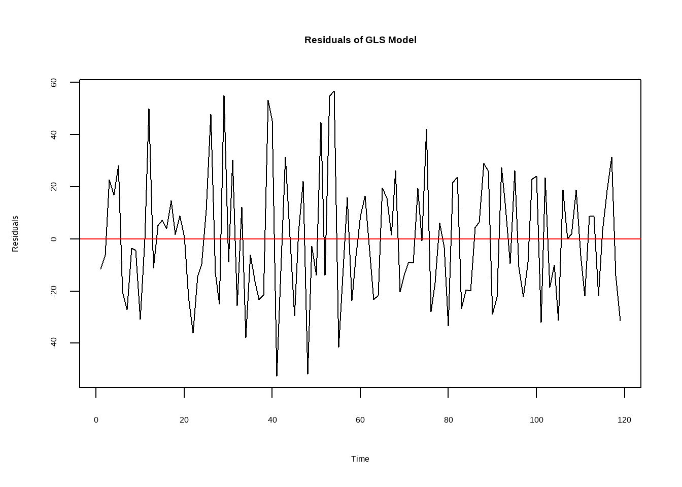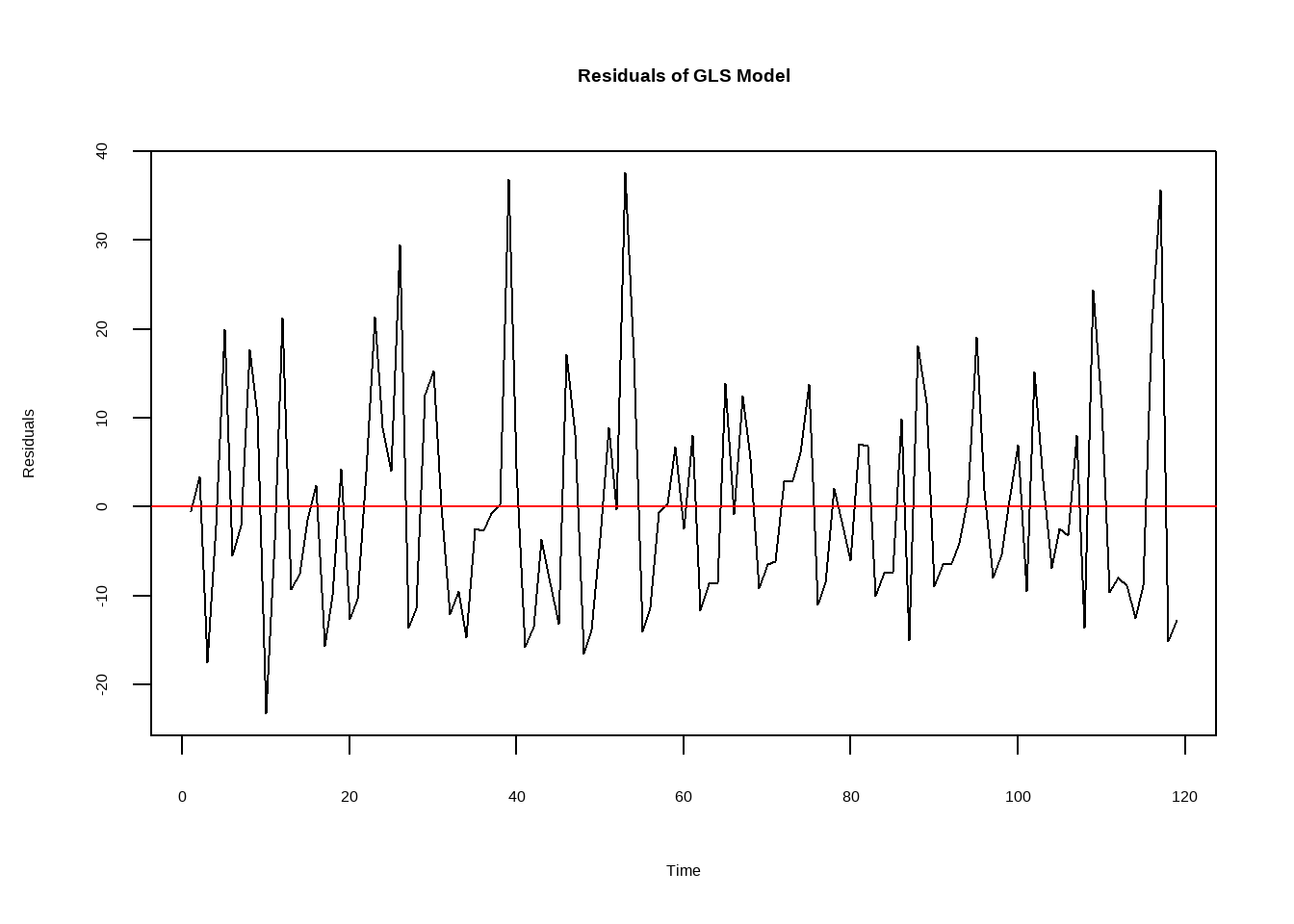 residuals_plot <-residuals(ITS_gls_multi_deposit_lag1)plot(residuals_plot, type ="l", main ="Residuals of GLS Model", xlab ="Time", ylab ="Residuals")abline(h =0, col ="red")