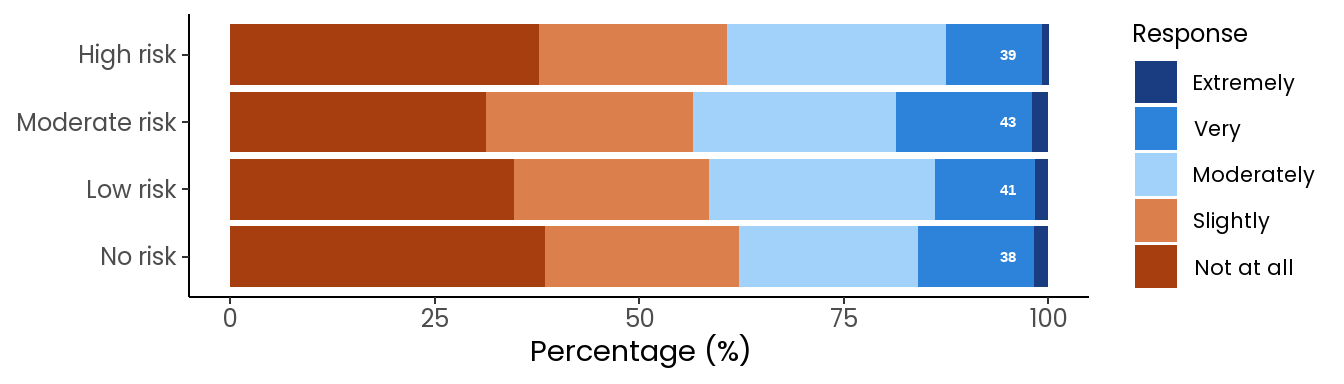 # Define a function to create weighted frequency and percentage tablescreate_weighted_table <-function(var_name) { freq_table <-svytable(as.formula(paste("~", var_name)), survey_design) prop_table <-prop.table(freq_table) percentages <- prop_table %>%as.data.frame() %>%mutate('Percent'=round(Freq *100, 2)) %>%rename(Response =!!sym(var_name)) %>%select(-Freq) %>%mutate(Variable = var_name) # Add variable name for identificationreturn(percentages)}# List of variables to processvariables <-c("ACT2_1", "ACT2_2", "ACT2_3", "ACT2_4", "ACT2_5", "ACT2_6", "ACT2_7", "ACT2_8")# Apply the function to each variable and combine resultsweighted_tables <-lapply(variables, create_weighted_table)combined_table <-bind_rows(weighted_tables) %>%mutate(Variable =case_when( Variable =="ACT2_1"~"Activity Statements", Variable =="ACT2_2"~"Bank Statements", Variable =="ACT2_3"~"Setting a deposit limit on my account", Variable =="ACT2_4"~"Only gambling what I have in my account", Variable =="ACT2_5"~"Setting a budget", Variable =="ACT2_6"~"Recording my bets", Variable =="ACT2_7"~"Using site 'check-in' tool", Variable =="ACT2_8"~"Other" )) %>%mutate(Variable =factor(Variable, levels =c("Activity Statements","Bank Statements","Setting a deposit limit on my account","Only gambling what I have in my account","Setting a budget","Recording my bets","Using site 'check-in' tool","Other" )))# Ensure Response is a factor with the correct levels in the desired ordercombined_table$Response <-factor(combined_table$Response, levels =rev(c('Not Important', 'Slightly Important', 'Moderately Important', 'Important', 'Very Important')))# Display the combined table using gtcombined_table %>%pivot_wider(names_from = Response, values_from = Percent) %>%gt() %>%tab_options(data_row.padding =px(3)) %>%tab_header("Responses to most useful tools question", subtitle =md("***Weighted outcomes***"))