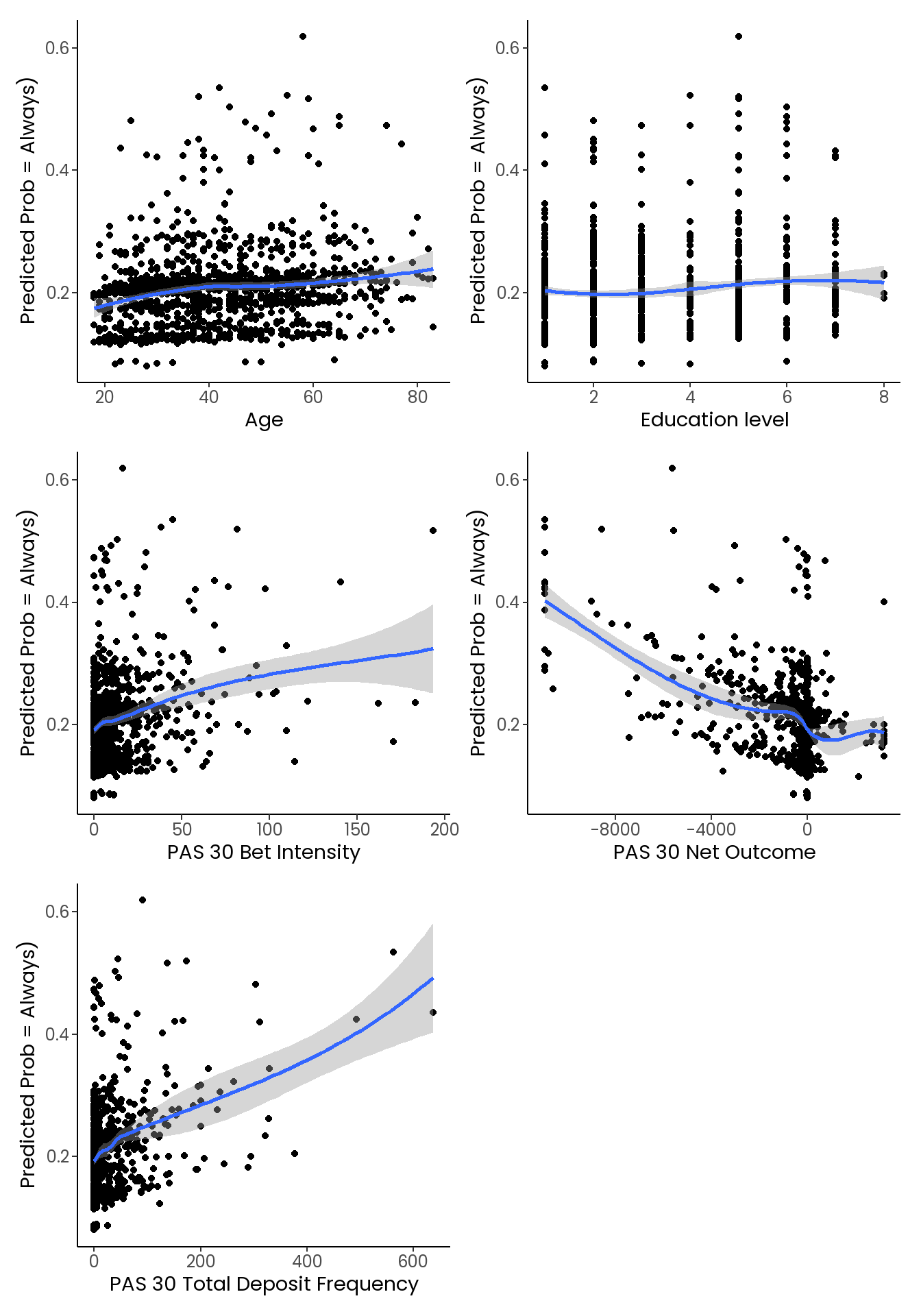 # Gender percentagesq_table_GENDER <-svytable(~GENDER, survey_design)prop_table_GENDER <-prop.table(q_table_GENDER)GENDER_Percentages <- prop_table_GENDER %>%as.data.frame() %>%mutate('Percent'=round(Freq*100, 2)) %>%select(-Freq) %>%mutate(Characteristic =paste("Gender:", GENDER),Value =paste0(Percent, "%")) %>%select(Characteristic, Value)# Age mean and SDAge_mean <-svymean(~AGE, survey_design, na.rm =TRUE) %>%as.data.frame() %>%t() %>%as.data.frame() %>%rownames_to_column() %>%filter(rowname =="mean")Age_sd <-svyvar(~AGE, survey_design, na.rm =TRUE) %>%as.data.frame() %>%rownames_to_column() %>%mutate(SD =sqrt(variance)) %>%select(SD)Age_summary <-bind_cols(Age_mean, Age_sd) %>%mutate(Characteristic ="Age",Value =paste0(round(AGE, 2), " (", round(SD, 2), ")")) %>%select(Characteristic, Value)# PGSI mean and SDPGSI_TOTAL_mean <-svymean(~PGSI_TOTAL, survey_design, na.rm =TRUE) %>%as.data.frame() %>%t() %>%as.data.frame() %>%rownames_to_column() %>%filter(rowname =="mean") PGSI_TOTAL_sd <-svyvar(~PGSI_TOTAL, survey_design, na.rm =TRUE) %>%as.data.frame() %>%rownames_to_column() %>%mutate(SD =sqrt(variance)) %>%select(SD)PGSI_summary <-bind_cols(PGSI_TOTAL_mean, PGSI_TOTAL_sd) %>%mutate(Characteristic ="PGSI Total Score",Value =paste0(round(PGSI_TOTAL, 2), " (", round(SD, 2), ")")) %>%select(Characteristic, Value)# Education percentagesq_table_EDUCATION <-svytable(~EDUCATION, survey_design)prop_table_EDUCATION <-prop.table(q_table_EDUCATION)EDUCATION_Percentages <- prop_table_EDUCATION %>%as.data.frame()# Check column names to see the correct variable name# colnames(EDUCATION_Percentages)EDUCATION_Percentages <- EDUCATION_Percentages %>%mutate('Percent'=round(Freq*100, 2)) %>%select(-Freq) %>%mutate(Characteristic =paste("Education:", EDUCATION),Value =paste0(Percent, "%")) %>%select(Characteristic, Value)# Betting intensity mean and SDPAS_30_BET_INTENSITY_mean <-svymean(~PAS_30_BET_INTENSITY, survey_design, na.rm =TRUE) %>%as.data.frame() %>%t() %>%as.data.frame() %>%rownames_to_column() %>%filter(rowname =="mean") PAS_30_BET_INTENSITY_sd <-svyvar(~PAS_30_BET_INTENSITY, survey_design, na.rm =TRUE) %>%as.data.frame() %>%rownames_to_column() %>%mutate(SD =sqrt(variance)) %>%select(SD)Betting_intensity_summary <-bind_cols(PAS_30_BET_INTENSITY_mean, PAS_30_BET_INTENSITY_sd) %>%mutate(Characteristic ="Past 30 Day Betting Intensity",Value =paste0(round(PAS_30_BET_INTENSITY, 2), " (", round(SD, 2), ")")) %>%select(Characteristic, Value)# Past 30 day net outcome mean and SDPAS_30_NET_OUTCOME_mean <-svymean(~PAS_30_NET_OUTCOME, survey_design, na.rm =TRUE) %>%as.data.frame() %>%t() %>%as.data.frame() %>%rownames_to_column() %>%filter(rowname =="mean")PAS_30_NET_OUTCOME_sd <-svyvar(~PAS_30_NET_OUTCOME, survey_design, na.rm =TRUE) %>%as.data.frame() %>%rownames_to_column() %>%mutate(SD =sqrt(variance)) %>%select(SD)Net_outcome_summary <-bind_cols(PAS_30_NET_OUTCOME_mean, PAS_30_NET_OUTCOME_sd) %>%mutate(Characteristic ="Past 30 Day Net Outcome",Value =paste0(round(PAS_30_NET_OUTCOME, 2), " (", round(SD, 2), ")")) %>%select(Characteristic, Value)# Past 30 day deposit frequency mean and SDPAS_30_TOTAL_DEPOSIT_FREQ_mean <-svymean(~PAS_30_TOTAL_DEPOSIT_FREQ, survey_design, na.rm =TRUE) %>%as.data.frame() %>%t() %>%as.data.frame() %>%rownames_to_column() %>%filter(rowname =="mean") PAS_30_TOTAL_DEPOSIT_FREQ_sd <-svyvar(~PAS_30_TOTAL_DEPOSIT_FREQ, survey_design, na.rm =TRUE) %>%as.data.frame() %>%rownames_to_column() %>%mutate(SD =sqrt(variance)) %>%select(SD)Deposit_freq_summary <-bind_cols(PAS_30_TOTAL_DEPOSIT_FREQ_mean, PAS_30_TOTAL_DEPOSIT_FREQ_sd) %>%mutate(Characteristic ="Past 30 Day Deposit Frequency",Value =paste0(round(PAS_30_TOTAL_DEPOSIT_FREQ, 2), " (", round(SD, 2), ")")) %>%select(Characteristic, Value)# Active deposit limit percentagesq_table_ACTIVE_DEPOSIT_LIMIT <-svytable(~ACTIVE_DEPOSIT_LIMIT, survey_design)prop_table_ACTIVE_DEPOSIT_LIMIT <-prop.table(q_table_ACTIVE_DEPOSIT_LIMIT)Deposit_limit_Percentages <- prop_table_ACTIVE_DEPOSIT_LIMIT %>%as.data.frame() %>%mutate('Percent'=round(Freq*100, 2)) %>%select(-Freq) %>%mutate(Characteristic =paste("Active Deposit Limit:", ACTIVE_DEPOSIT_LIMIT),Value =paste0(Percent, "%")) %>%select(Characteristic, Value)# Combine all summariescombined_summary <-bind_rows(GENDER_Percentages, Age_summary, PGSI_summary, EDUCATION_Percentages, Betting_intensity_summary, Net_outcome_summary, Deposit_freq_summary, Deposit_limit_Percentages)# Display as a tablecombined_summary %>%gt()%>%tab_options(data_row.padding =px(3)) %>%tab_header("Table 1. Sample characteristics and use of activity statements")