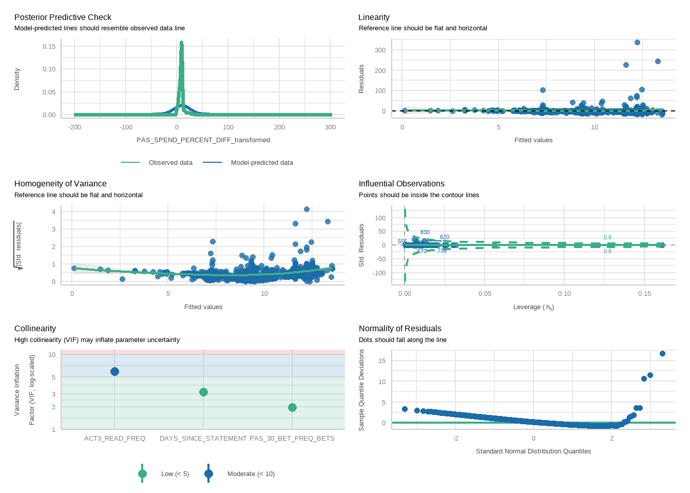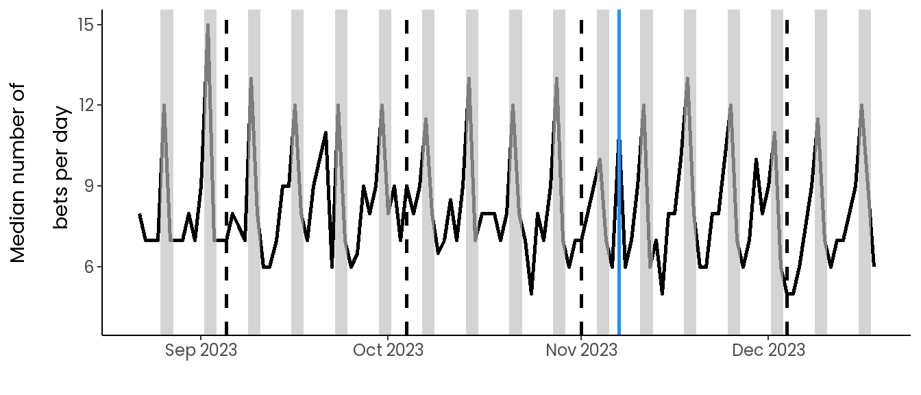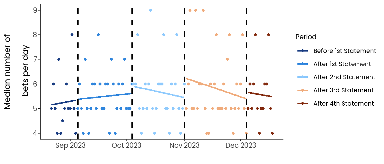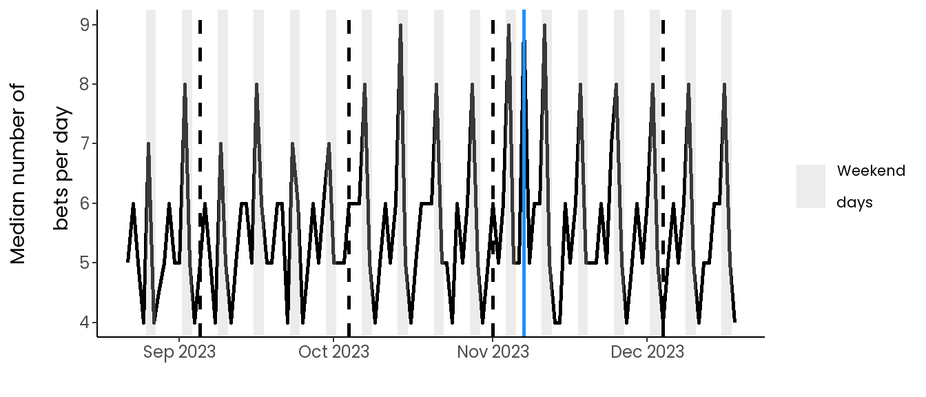 statement_dates_lag1 <- statement_dates +1# Create intervention indicators and time after intervention variablesbets_per_day_model_data$Post_Intervention1 <-as.numeric(bets_per_day_model_data$BET_PLACED_DATE >= statement_dates_lag1[1])bets_per_day_model_data$Post_Intervention2 <-as.numeric(bets_per_day_model_data$BET_PLACED_DATE >= statement_dates_lag1[2])bets_per_day_model_data$Post_Intervention3 <-as.numeric(bets_per_day_model_data$BET_PLACED_DATE >= statement_dates_lag1[3])bets_per_day_model_data$Post_Intervention4 <-as.numeric(bets_per_day_model_data$BET_PLACED_DATE >= statement_dates_lag1[4])# Time variables for each interventionbets_per_day_model_data$Time_After_Intervention1 <-pmax(0, as.numeric(bets_per_day_model_data$BET_PLACED_DATE - statement_dates_lag1[1]))bets_per_day_model_data$Time_After_Intervention2 <-pmax(0, as.numeric(bets_per_day_model_data$BET_PLACED_DATE - statement_dates_lag1[2]))bets_per_day_model_data$Time_After_Intervention3 <-pmax(0, as.numeric(bets_per_day_model_data$BET_PLACED_DATE - statement_dates_lag1[3]))bets_per_day_model_data$Time_After_Intervention4 <-pmax(0, as.numeric(bets_per_day_model_data$BET_PLACED_DATE - statement_dates_lag1[4]))ITS_gls_multi_bets_day_lag1 <-gls(median_bets_per_day ~ Time + Post_Intervention1 + Time_After_Intervention1 + Post_Intervention2 + Time_After_Intervention2 + Post_Intervention3 + Time_After_Intervention3 +Post_Intervention4 +Time_After_Intervention4 + weekend +pay_days + Melbourne_cup,data = bets_per_day_model_data,correlation =corAR1(form =~ Time |factor(weekend)))ITS_gls_multi_bets_day_lag1_summary <-summary(ITS_gls_multi_bets_day_lag1)ITS_gls_multi_bets_day_lag1_summary