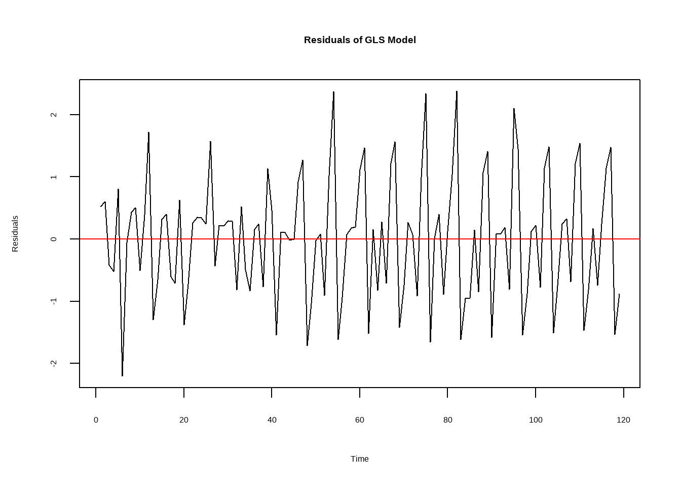 residuals_plot <-residuals(ITS_gls_multi_bets_day_lag1)plot(residuals_plot, type ="l", main ="Residuals of GLS Model", xlab ="Time", ylab ="Residuals")abline(h =0, col ="red")