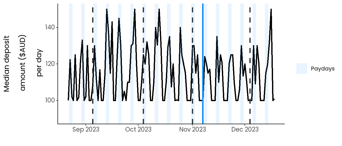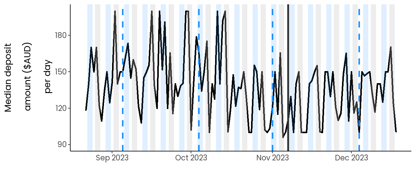 # Create intervention indicators and time after intervention variablesdeposit_amount_per_day_model_data$Post_Intervention1 <-as.numeric(deposit_amount_per_day_model_data$DATE >= statement_dates_lag1[1])deposit_amount_per_day_model_data$Post_Intervention2 <-as.numeric(deposit_amount_per_day_model_data$DATE >= statement_dates_lag1[2])deposit_amount_per_day_model_data$Post_Intervention3 <-as.numeric(deposit_amount_per_day_model_data$DATE >= statement_dates_lag1[3])deposit_amount_per_day_model_data$Post_Intervention4 <-as.numeric(deposit_amount_per_day_model_data$DATE >= statement_dates_lag1[4])# Time variables for each interventiondeposit_amount_per_day_model_data$Time_After_Intervention1 <-pmax(0, as.numeric(deposit_amount_per_day_model_data$DATE - statement_dates_lag1[1]))deposit_amount_per_day_model_data$Time_After_Intervention2 <-pmax(0, as.numeric(deposit_amount_per_day_model_data$DATE - statement_dates_lag1[2]))deposit_amount_per_day_model_data$Time_After_Intervention3 <-pmax(0, as.numeric(deposit_amount_per_day_model_data$DATE - statement_dates_lag1[3]))deposit_amount_per_day_model_data$Time_After_Intervention4 <-pmax(0, as.numeric(deposit_amount_per_day_model_data$DATE - statement_dates_lag1[4]))ITS_gls_multi_deposit_lag1<-gls(median_deposited_per_day ~ Time + Post_Intervention1 + Time_After_Intervention1 + Post_Intervention2 + Time_After_Intervention2 + Post_Intervention3 + Time_After_Intervention3 +Post_Intervention4 +Time_After_Intervention4 + weekend +pay_days+ Melbourne_cup,data = deposit_amount_per_day_model_data,correlation =corAR1(form =~ Time |factor(weekend)))ITS_gls_multi_deposit_lag1_summary<-summary(ITS_gls_multi_deposit_lag1)ITS_gls_multi_deposit_lag1_summary